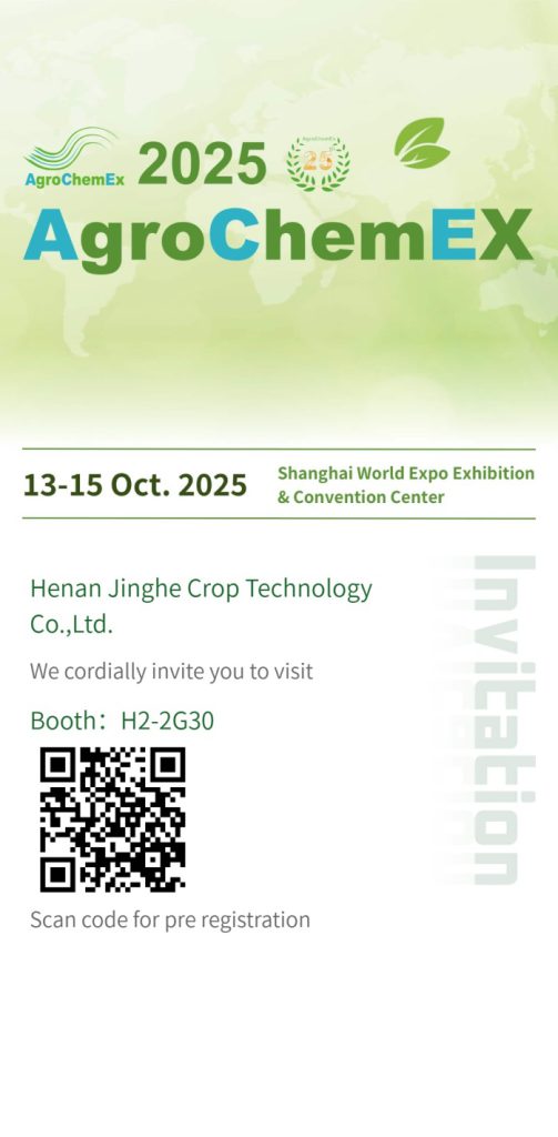 The 2025 International Agrochemical Products Exhibition will be held at the Shanghai World Expo Exhibition & Convention Center from October 13 to 15, 2025. As an agrochemical company dedicated to serving global agriculture, Henan Jinghe Crop Technology Co., Ltd. will participate in this exhibition. We will showcase our technological capabilities and latest products to both new and existing clients. We cordially invite you to visit our booth for discussions and exchanges. We look forward to your presence,booth :H2-2G30